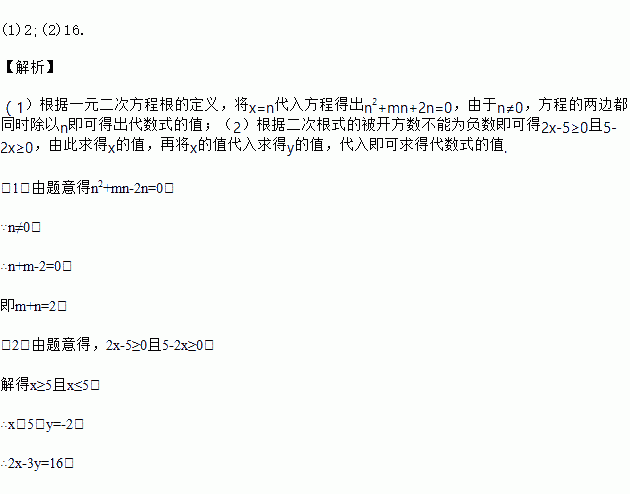 (1)若 n(n≠0)是关于 的方程 x²+mx-2n=0的根,求 m+n的值; ![]()