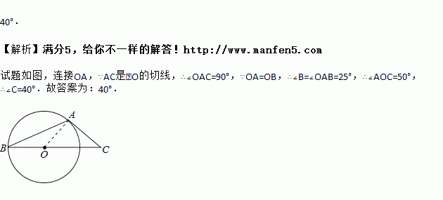 如图,AB是⊙O的弦,AC是⊙O的切线,A为切点,BC经过圆心,若∠B=25°,则∠C=______.