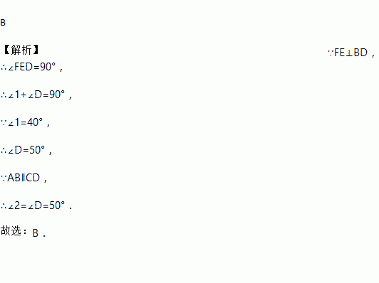 如图,AB∥CD,FE⊥DB,垂足为E,∠1=40°,则∠2的度数是( )