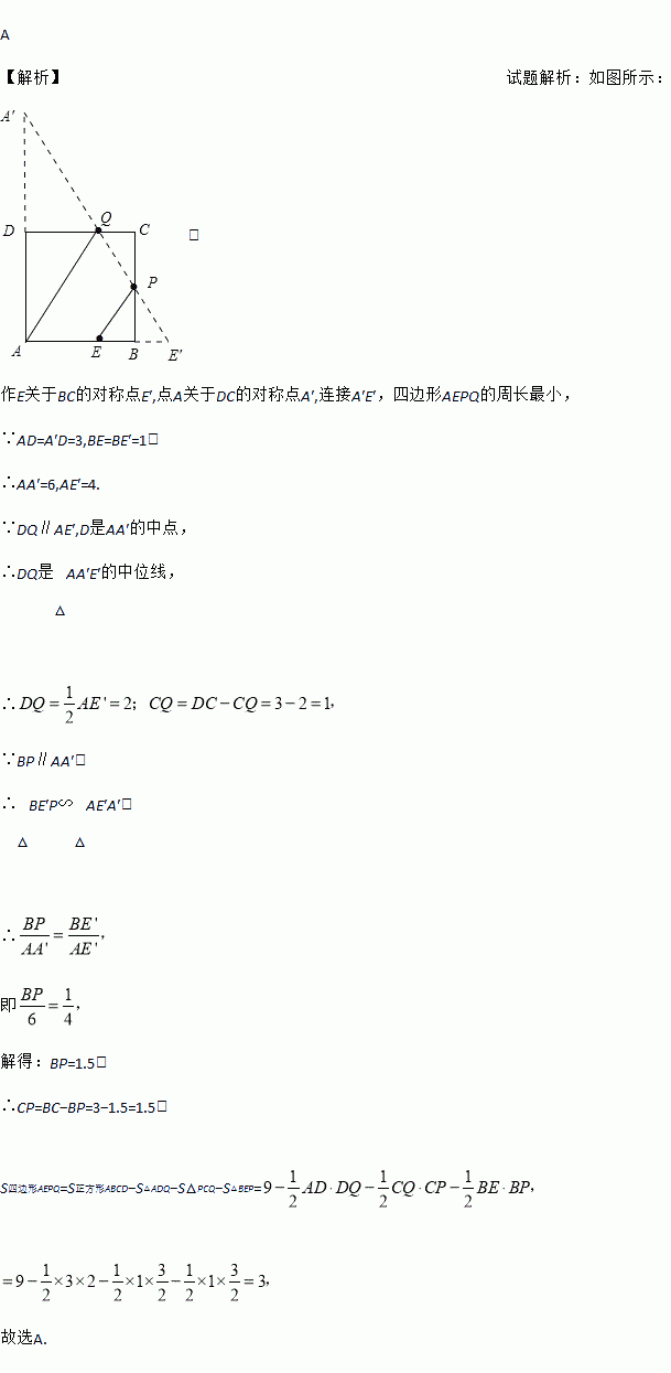 如图,已知正方形ABCD边长为3,点E在AB边上且BE=1,点P,Q分别是边BC,CD的动点(均不与顶点重合),当四边形AEPQ的周长取最小值时,四边形AEPQ的面积是( )