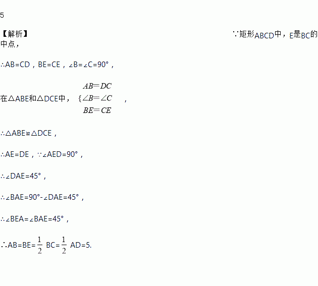 如图,在矩形ABCD中,E为BC的中点,且∠AED=90°,AD=10,则AB的长为____.