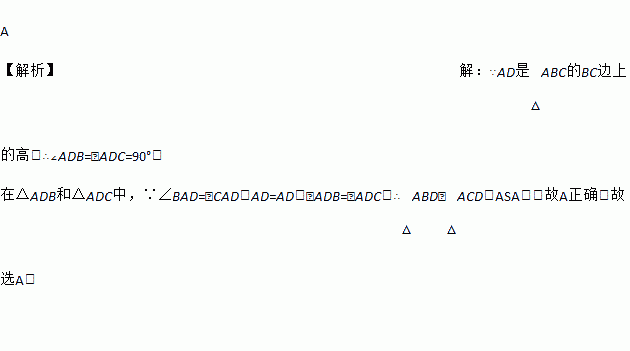 A 【解析】【解析】 ∵AD是△ABC的BC边上的高,∴∠ADB=∠ADC=90°. 在△ADB和△ADC中,∵∠BAD=∠CAD,AD=AD,∠ADB=∠ADC,∴△ABD≌△ACD(ASA).故A正确.故选A.
