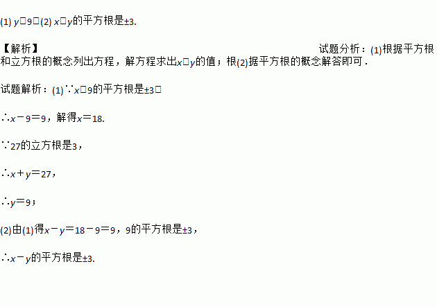 (1) y=9;(2) x-y的平方根是±3. 【解析】试题分析:(1)根据平方根和立方根的概念列出方程,解方程求出x,y的值;根(2)据平方根的概念解答即可. 试题解析:(1)∵x-9的平方根是±3, ∴x-9=9,解得x=18. ∵27的立方根是3, ∴x+y=27, ∴y=9; (2)由(1)得x-y=18-9=9,9的平方根是±3, ∴x-y...