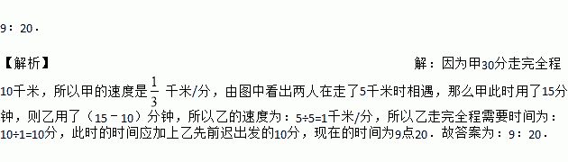 已知A,B两地相距10千米,上午9:00甲骑电动车从A地出发到B地,9:10乙开车从B地出发到A地,甲、乙两人距A地的距离y(千米)与甲所用的时间x(分)之间的关系如图所示,则乙到达A地的时间为______.