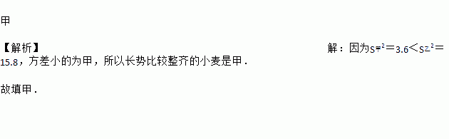 甲 【解析】【解析】 因为S甲2=3.6<S乙2=15.8,方差小的为甲,所以长势比较整齐的小麦是甲. 故填甲.