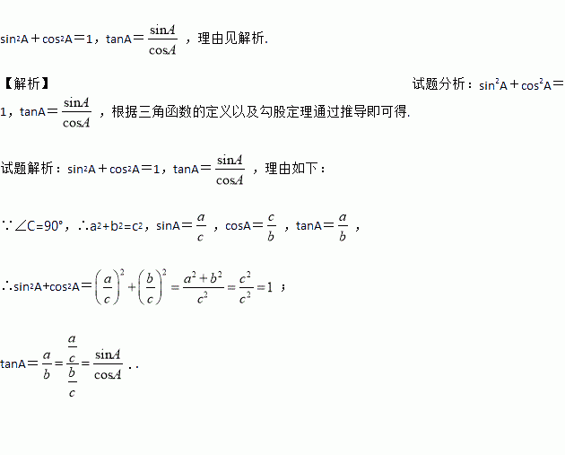 .我们不难发现:sin260°+cos260°=1,…,试探求sinA、cosA、tanA之间存在的一般关系,并说明理由.