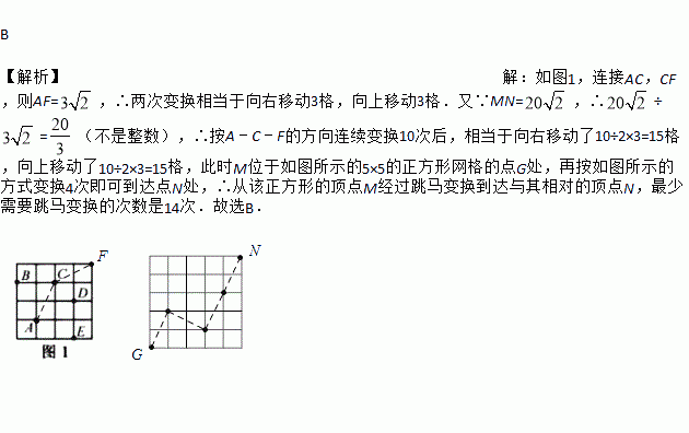 的另一个格点的运动称为一次跳马变换.例如,在4×4的正方形网格图形中(如图1),从点A经过一次跳马变换可以到达点B,C,D,E等处.现有20×20的正方形网格图形(如图2),则从该正方形的顶点M经过跳马变换到达与其相对的顶点N,最少需要跳马变换的次数是( )