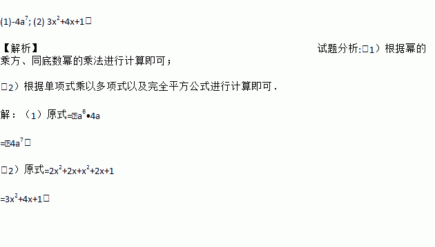 (1)-4a7; (2) 3x2+4x+1. 【解析】试题分析:(1)根据幂的乘方、同底数幂的乘法进行计算即可; (2)根据单项式乘以多项式以及完全平方公式进行计算即可. 【解析】 (1)原式=﹣a6•4a =﹣4a7; (2)原式=2x2+2x+x2+2x+1 =3x2+4x+1.