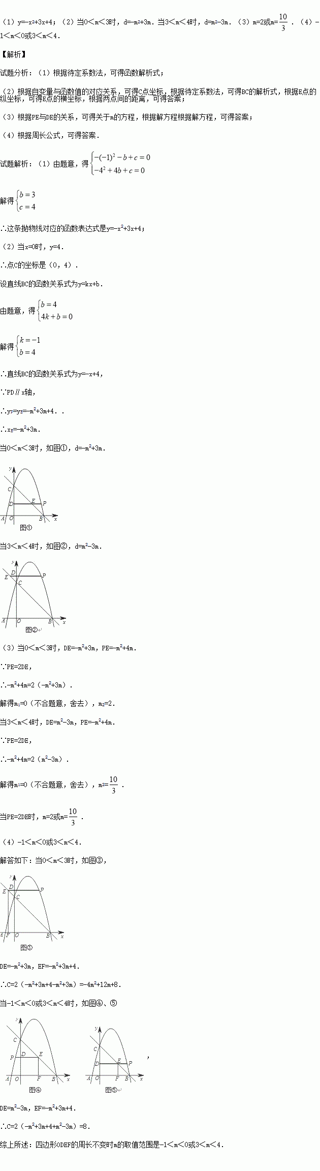 如图①,在平面直角坐标系中,抛物线y=-x2+bx+c与x轴交于点A、B,点A、B的坐标分别是(-1,0)、(4,0),与y轴交于点C,点P在第一、二象限的抛物线上,过点P作x轴的平行线分别交y轴和直线BC于点D、E,设点P的横坐标为m,线段DE的长度为d.