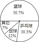 体育委员统计出班上喜欢足球的同学占12%,喜欢乒乓球的同学占30.3%,喜欢篮球的同学占50.7%,喜欢其他球类的同学占7%,问:能否制作扇形统计图?若能,请作出;若不能,请说明理由.