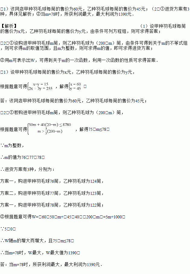 £¨2£©¸ù¾ÝÏû·ÑÕßÐèÇ󣬸ÃÍøµê¾ö¶¨Óò»³¬¹ý8780Ôª¹º½ø¼×¡¢ÒÒÁ½ÖÖÓðëÇò¹²200Ͳ£¬ÇÒ¼×ÖÖÓðëÇòµÄÊýÁ¿´óÓÚÒÒÖÖÓðëÇòÊýÁ¿µÄ