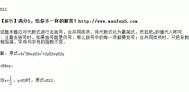 当x=-,y=-3时,求代数式 3(x2﹣2xy)﹣[3x2﹣2y+2(xy+y)]的值.
