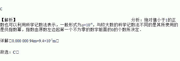 某红外线遥控器发出的红外线波长为0.000 000 94m,用科学记数法表示这个数为( )