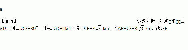 如图,C、D分别是一个湖的南、北两端A和B正东方向的两个村庄,CD=6km,且D位于C的北偏东30°方向上,则AB的长为( )