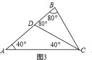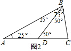 (2)如图2,在∠ABC中作∠ABD=25°,则根据三角形内角和和等腰三角形的判定可得到△DAC和△DBC两个等腰三角形;在图3中,∠ACD=40°可得到两个等腰三角形;图4不能作;