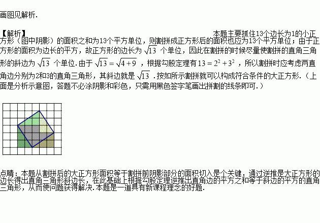 如图,13个边长为1的小正方形,排列形式如图,把它们分割,使分割后能拼成一个大正方形.请在如图所示的网格中(网格的边长为1)中,用直尺作出这个大正方形.