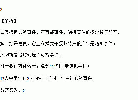 下列事件中,①打开电视,它正在播关于扬州特产的广告;②太阳绕着地球转;③掷一枚正方体骰子,点数“4”朝上;④13人中至少有2人的生日是同一个月.属于随机事件的个数是 .