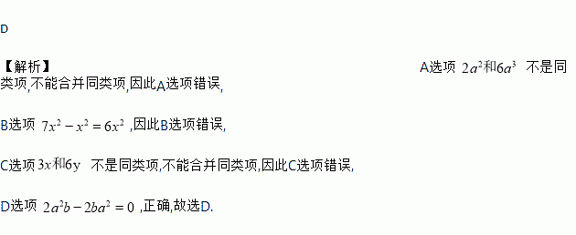 A. 2x+3y=5xy B. 3x-x=3 C. 2x+3x=5x2 D. -x2-x2=-2x2