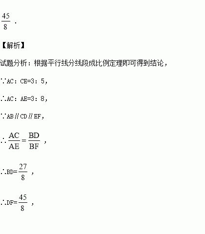 如图,已知AB∥CD∥EF,它们依次交直线l1、l2于点A、C、E和点B、D、F,如果AC:CE=3:5,BF=9,那么DF= .
