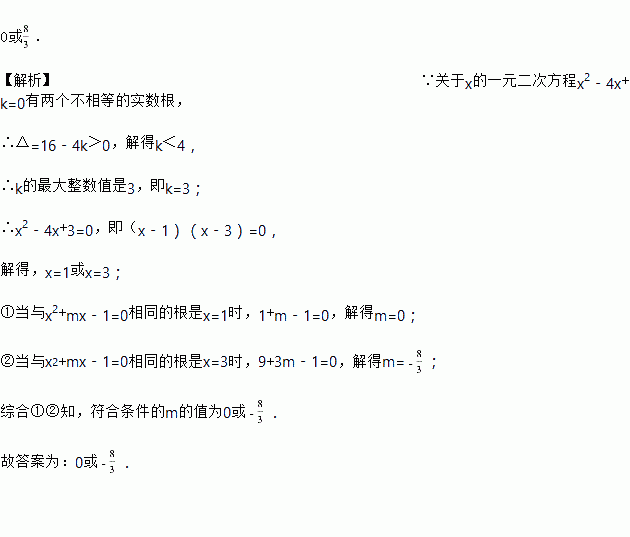 已知关于x的一元二次方程x2﹣4x+k=0有两个不相等的实数根,且该方程与x2+mx﹣1=0有一个相同的根.当k为符合条件的最大整数时,m的值为 _____.