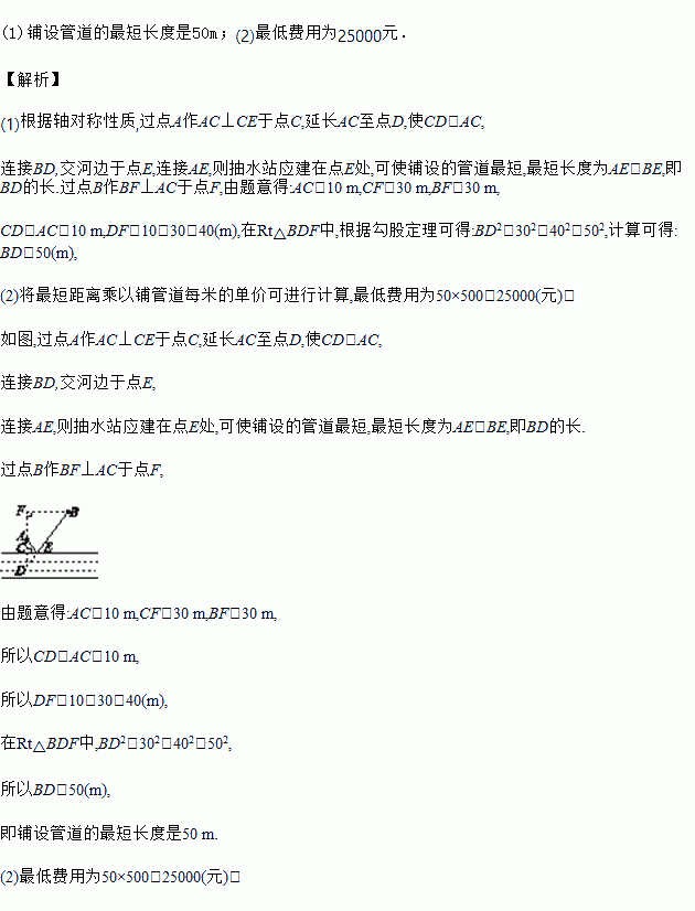 如图,河边有A,B两个村庄,A村距河边10 m,B村距河边30 m,两村平行于河边方向的水平距离为30 m,现要在河边建一抽水站,需铺设管道抽水到A村和B村.