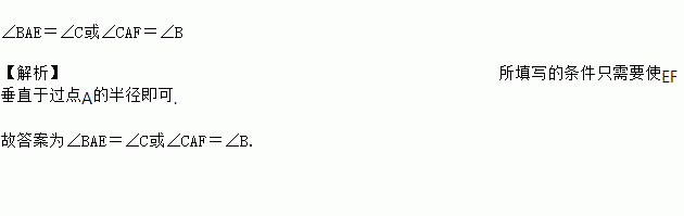 如图,△ABC内接于⊙O,要使过点A的直线EF与⊙O相切于A点,则图中的角应满足的条件是________(只填一个即可).