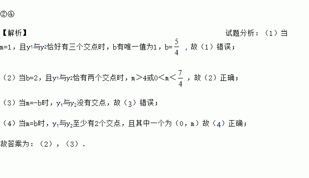 ②④ 【解析】试题分析:(1)当m=1,且y1与y2恰好有三个交点时,b有唯一值为1,b=,故(1)错误; (2)当b=2,且y1与y2恰有两个交点时,m>4或0<m<,故(2)正确; (3)当m=-b时,y1与y2没有交点,故(3)错误; (4)当m=b时,y1与y2至少有2个交点,且其中一个为(0,m)故(4)正确; 故答案为:(2),(3).