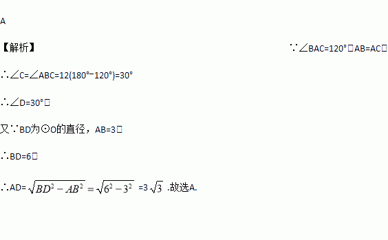 如图,△ABC内接于⊙O,∠BAC=120°,AB=AC,BD为⊙O的直径,AB=3,则AD的值为( ).