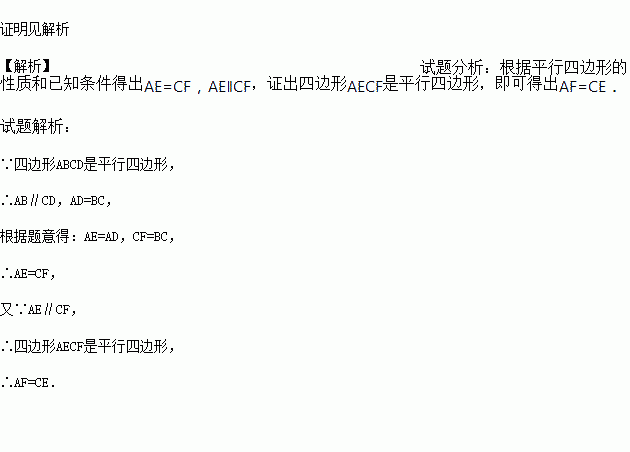 如图,已知?ABCD,AB>AD,分别以点A,C为圆心,以AD,CB长为半径作弧,交AB,CD于点E,F,连接AF,CE.求证:AF=CE.