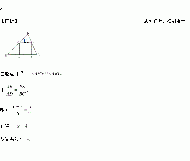 如图△ABC中,边BC=12cm,高AD=6cm,边长为x的正方形PQMN的一边在BC上,其余两个顶点分别在AB、AC上,则正方形的边长x=_____cm.
