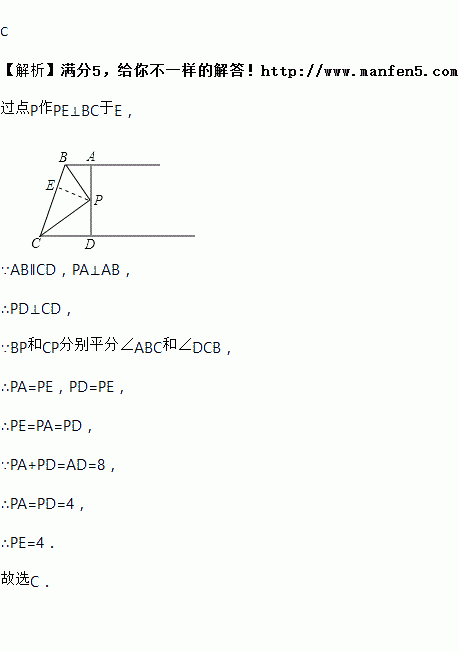 如图,AB∥CD,BP和CP分别平分∠ABC和∠DCB,AD过点P,且与AB垂直.若AD=8,则点P到BC的距离是( )