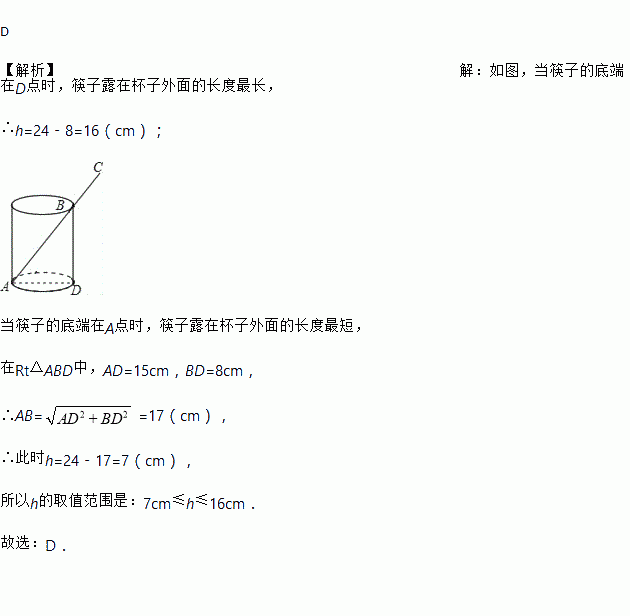 D 【解析】【解析】 如图,当筷子的底端在D点时,筷子露在杯子外面的长度最长, ∴h=24﹣8=16(cm); 当筷子的底端在A点时,筷子露在杯子外面的长度最短, 在Rt△ABD中,AD=15cm,BD=8cm, ∴AB==17(cm), ∴此时h=24﹣17=7(cm), 所以h的取值范围是:7cm≤h≤16cm. 故选:D.