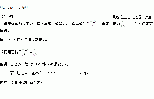 (1)240;(2)5. 【解析】此题注意总人数是不变的,租用客车数也不变,设七年级人数是x人,客车数为,也可表示为+1,列方程即可解得. 【解析】 (1)设七年级人数是x人, 根据题意得=+1, 解得:x=240.故七年级学生人数是240人. (2)原计划租用45座客车:(240﹣15)÷45=5(辆). 故原计划租用45座客车5辆.