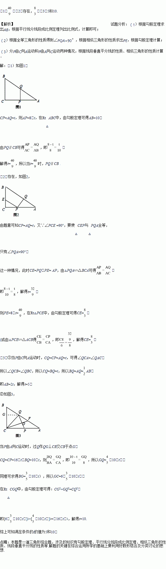 (2)在点P从C向A运动的过程中,在CB上是否存在点E使△CEP与△PQA全等?若存在,求出CE的长;若不存在,请说明理由;