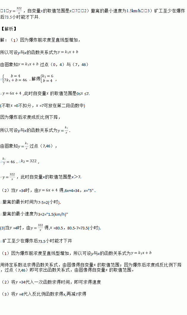 近年来,我国煤矿安全事故频频发生,其中危害最大的是瓦斯,其主要成分是CO.在一次矿难事件的调查中发现:从零时起,井内空气中CO的浓度达到4 mg/L,此后浓度呈直线型增加,在第7小时达到最高值46 mg/L,发生爆炸;爆炸后,空气中的CO浓度成反比例下降.如图,根据题中相关信息回答下列问题: