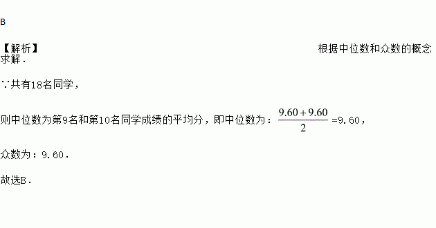 B 【解析】根据中位数和众数的概念求解. ∵共有18名同学, 则中位数为第9名和第10名同学成绩的平均分,即中位数为:=9.60, 众数为:9.60. 故选B.