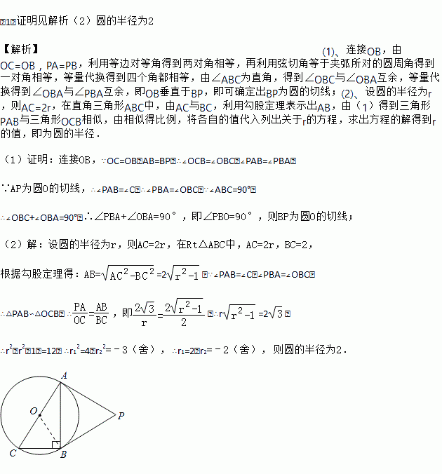 (2)已知PA=2,BC=2.求⊙O的半径.