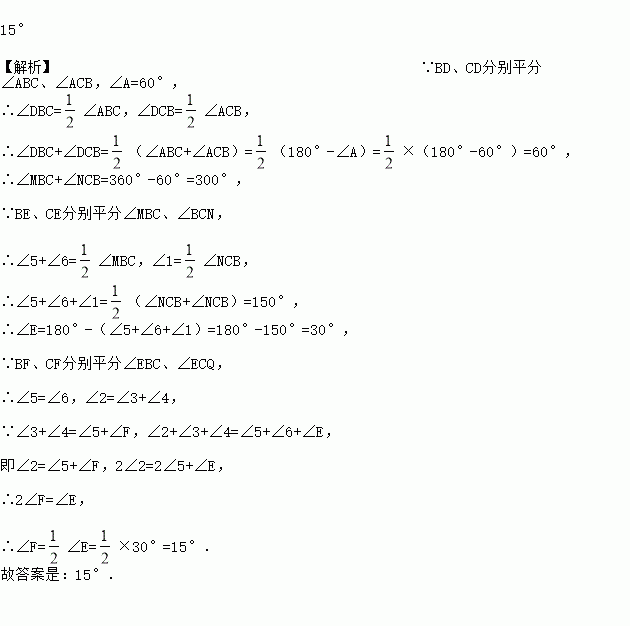 如图,在△ABC中,∠A=60°,BD、CD分别平分∠ABC、∠ACB,M、N、Q分别在DB、DC、BC的延长线上,BE、CE分别平分∠MBC、∠BCN,BF、CF分别平分∠EBC、∠ECQ,则∠F=________.