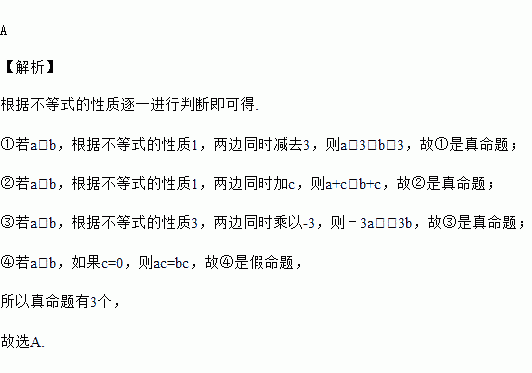 下列四个命题:①若a>b,则a﹣3>b﹣3;②若a>b,则a+c>b+c;③若a>b,则﹣3a<﹣3b;④若a>b,则ac>bc.其中,真命题的个数有( )