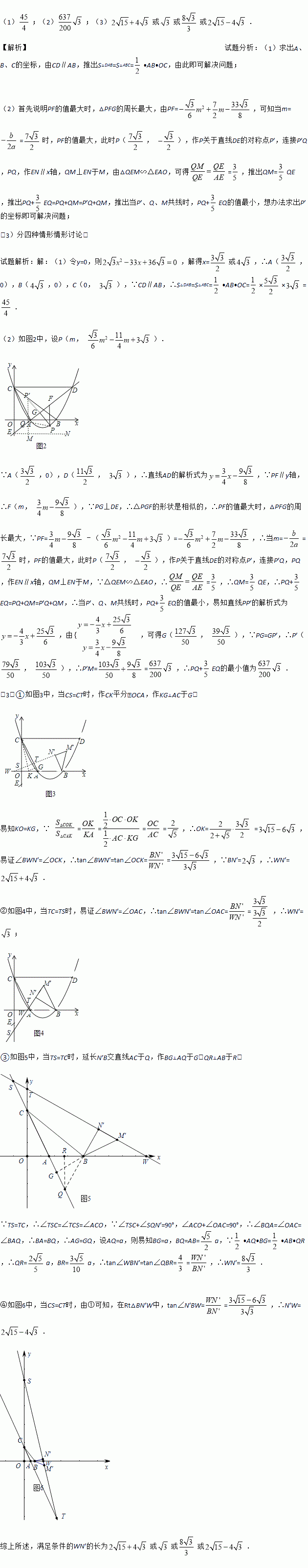 (1);(2);(3)或或或. 【解析】试题分析:(1)求出A、B、C的坐标,由CD∥AB,推出S△DAB=S△ABC=•AB•OC,由此即可解决问题; (2)首先说明PF的值最大时,△PFG的周长最大,由PF=,可知当m==时,PF的值最大,此时P(, ),作P关于直线DE的对称点P′,连接P′Q,PQ,作EN∥x轴,QM⊥EN于M,由△QEM∽△EAO,可得=,推出QM=QE,推出...