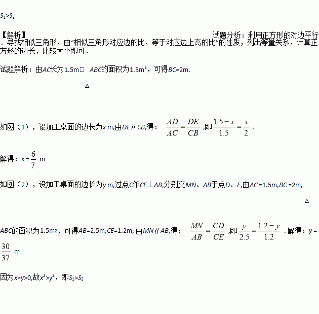 一块直角三角形的木板,它的一条直角边AC长为1.5米,面积为1.5平方米.现在要把它加工成一个正方形桌面,甲、乙两人的加工方法分别如图(ⅰ)、(ⅱ)所示,记两个正方形面积分别为S1、S2,请通过计算比较S1与S2的大小.