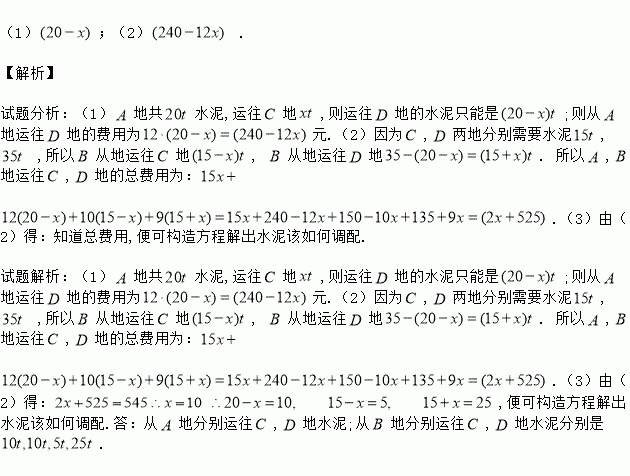 (1)(20-x)吨,(9x+135)元;(2)2x+525; (3)555 【解析】试题分析:(1)仓库原有的20吨去掉运到工地的水泥,就是运到工地的水泥;首先求出仓库运到仓库的吨数,也就是工地需要的水泥减去从A仓库运到工地的水泥,再乘每吨的运费即可; (2)用表示出两个仓库分别向运送的吨数,再乘每吨的运费,然后合并起来即可; (3)把代入(2)中的代数式,求得问题的解. 试题解...