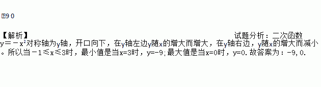 -9 0 【解析】试题分析:二次函数y=-x2对称轴为y轴,开口向下,在y轴左边y随x的增大而增大,在y轴右边,y随x的增大而减小。所以当-1≤x≤3时,最小值是当x=3时,y=-9;最大值是当x=0时,y=0.故答案为:-9,0.