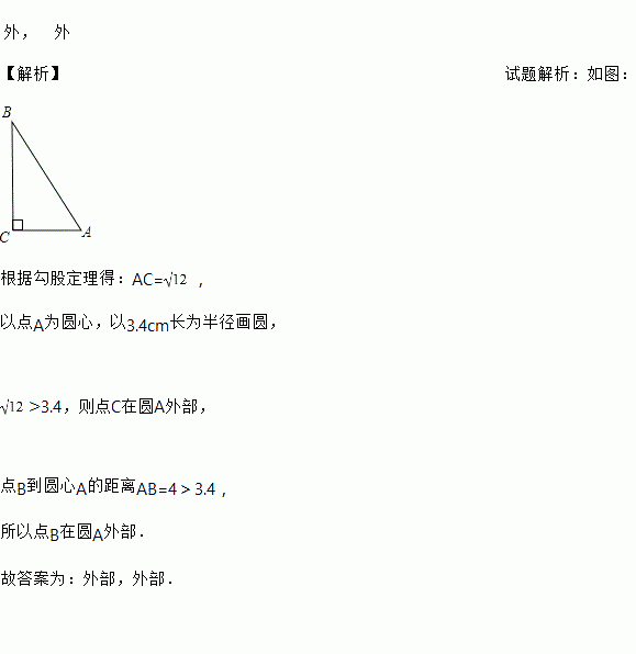 △ABC中, ∠C=90°, AB=4cm, BC=2cm, 以点A为圆心, 以3.4cm的长为半径画圆, 则点C在⊙O_____________, 点B在⊙O____________.