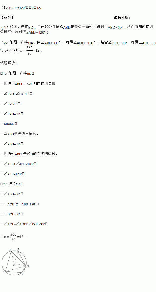 (2)连接OD、OE,当∠DOE=90°时,AE恰好为⊙O的内接正n边形的一边,求n的值.