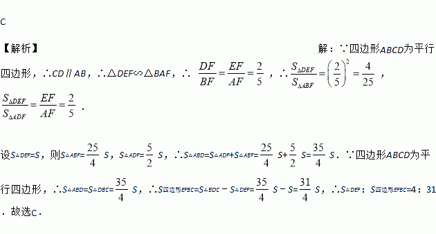 C 【解析】【解析】 ∵四边形ABCD为平行四边形,∴CD∥AB,∴△DEF∽△BAF,∴ ,∴, . 设S△DEF=S,则S△ABF=S,S△ADF=S,∴S△ABD=S△ADF+S△ABF=S+S=S.∵四边形ABCD为平行四边形,∴S△ABD=S△DBC=S,∴S四边形EFBC=S△BDC﹣S△DEF=S﹣S=S,∴S△DEF:S四边形EFBC=4:31.故选C.