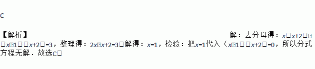 C 【解析】【解析】 去分母得:x(x+2)﹣(x﹣1)(x+2)=3,整理得:2x﹣x+2=3,解得:x=1,检验:把x=1代入(x﹣1)(x+2)=0,所以分式方程无解.故选C.