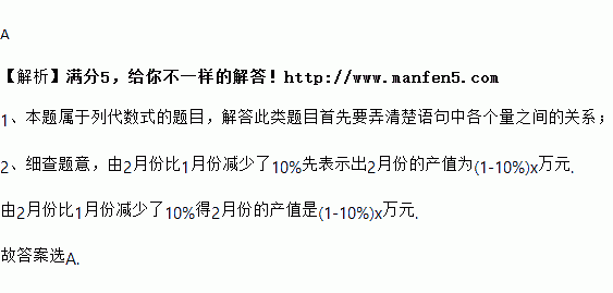 某企业今年1月份产值为x万元,2月份的产值比1月份减少了10%,则2月份的产值是( )