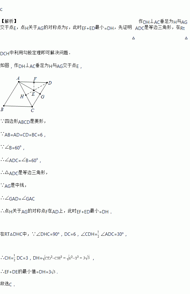 如图,在菱形ABCD中,AB=6,∠B=60°,点G是CD边的中点,点E、F分别是AG、AD上的两个动点,则EF+ED的最小值是( )
