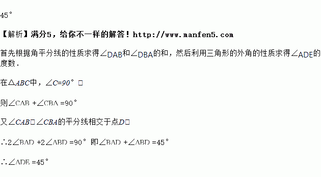 如图所示,在△ABC中,∠C=900,∠CAB,∠CBA的平分线相交于点D,BD的延长线交AC于E,求∠ADE的度数.